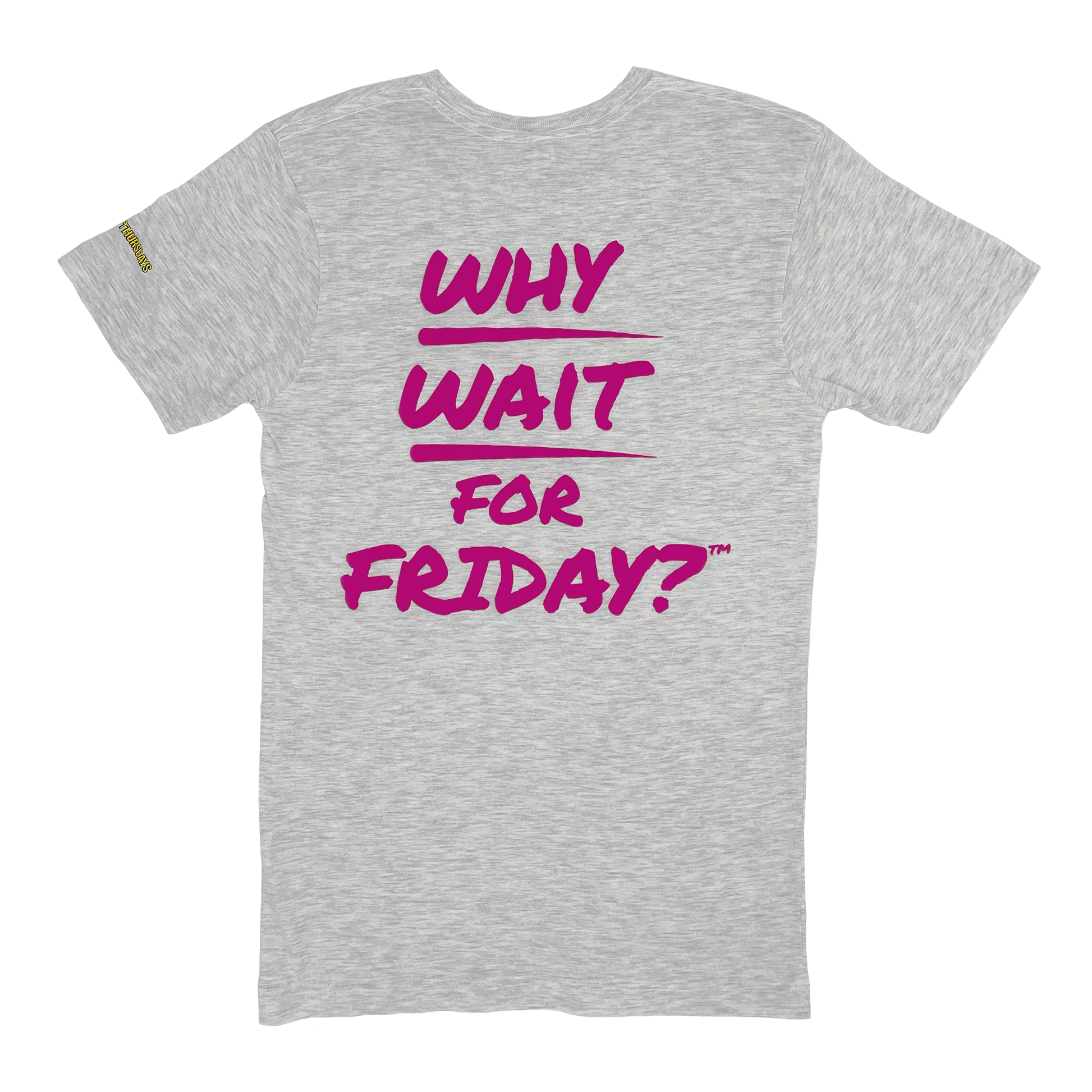 Made from super soft ring-spun cotton jersey in light heather grey, this tee proudly features a puff print that asks, "WHY WAIT FOR FRIDAY?" Wear it any day of the week! We recommend Thursday...